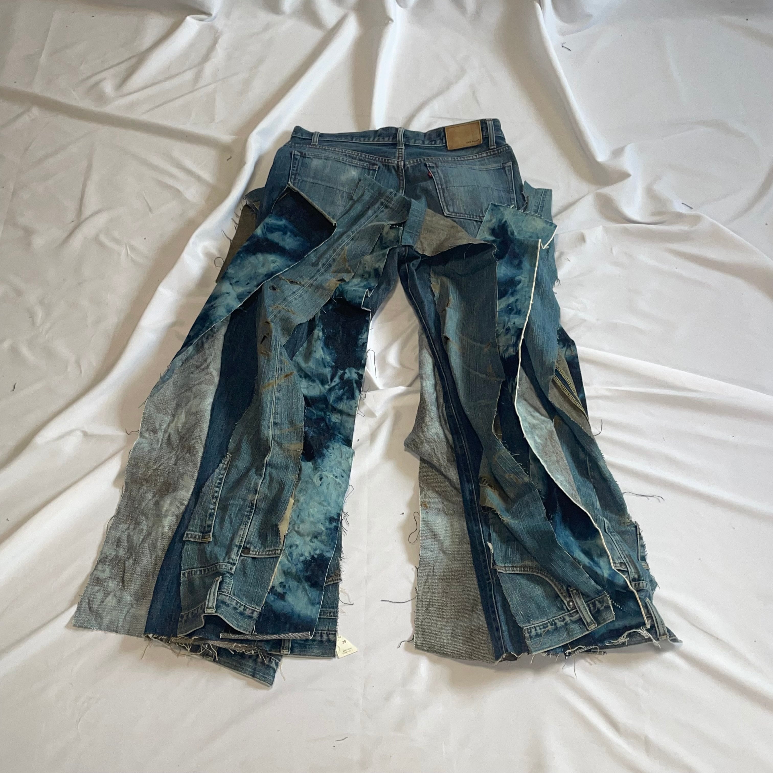 デニムを基に縦に切ったデニムを再構築したワイドパンツです。 ウエスト:76cm 股上:28cm 股下:73cm 裾幅:31cm わたり幅:31cm