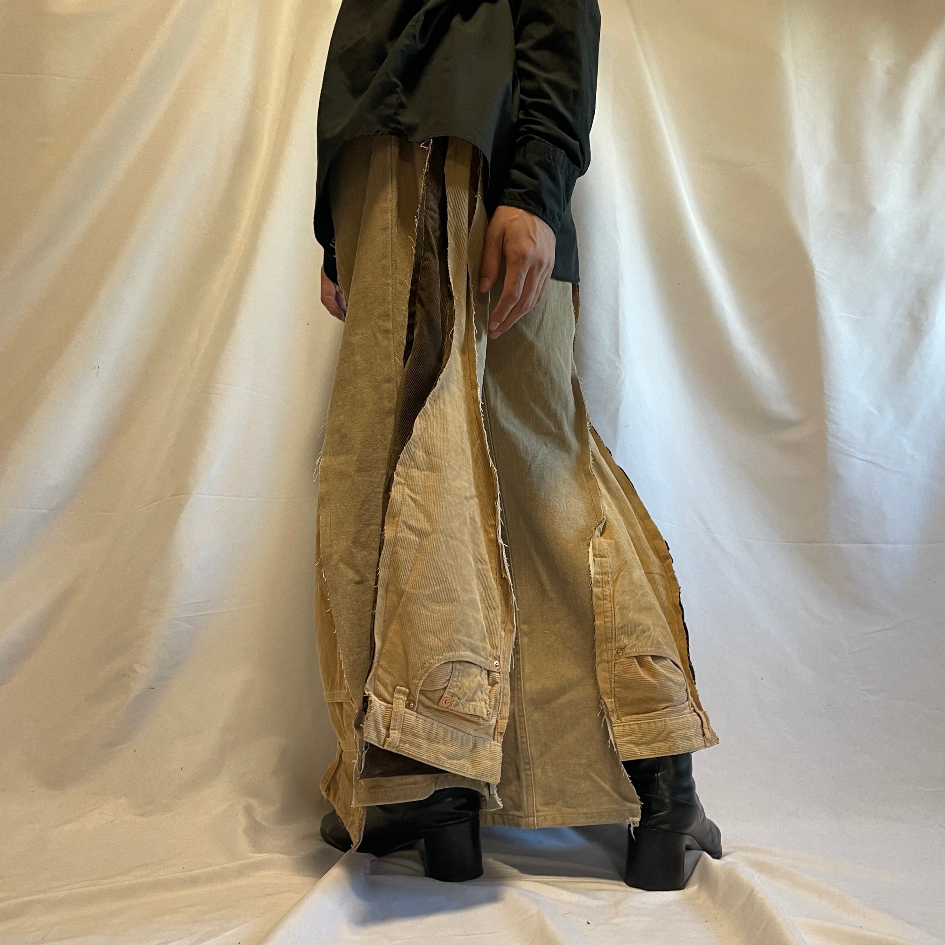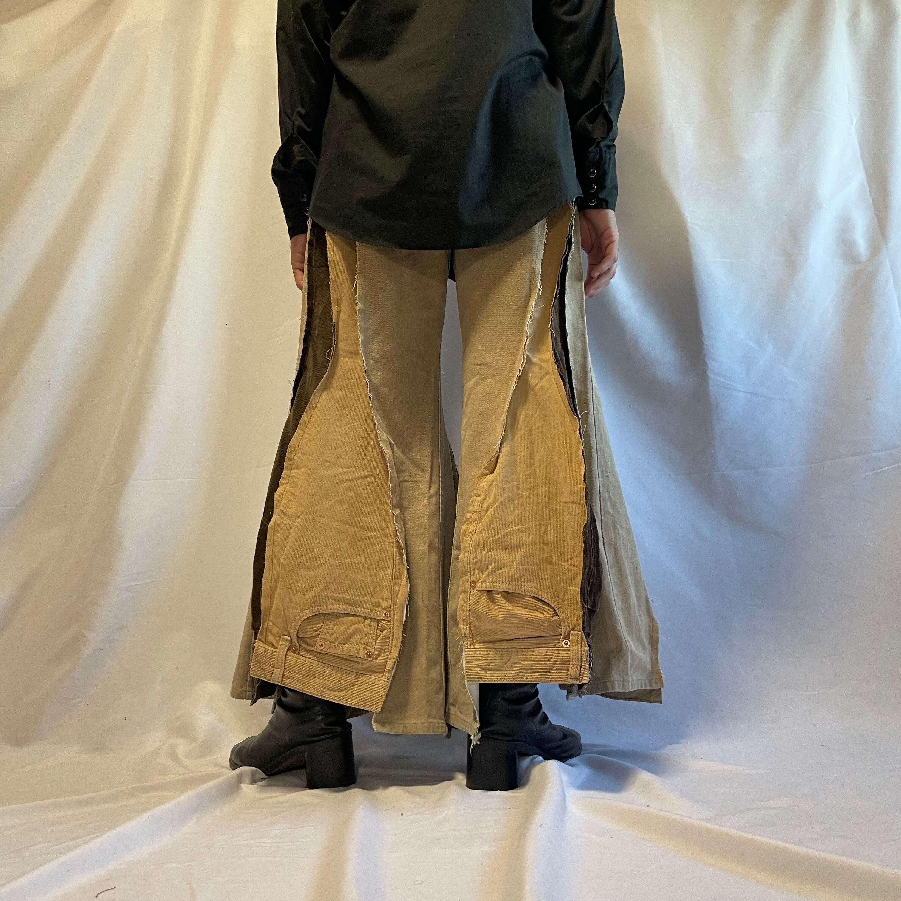 ベージュ系のデニムとコーデュロイパンツを使い、ハカマパンツに再構築しました。
